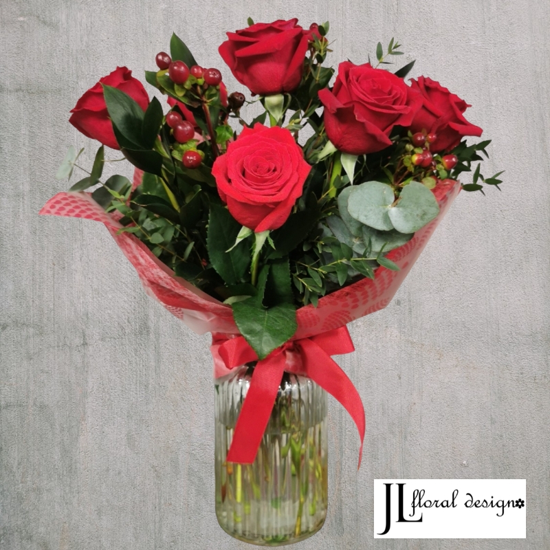 Presented in a Glass Vase with Eucalyptus & Hypericum.