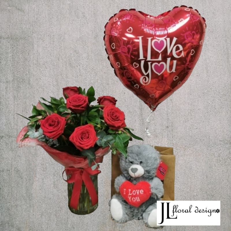 Includes - Chocolates, I love you Teddy Bear & Balloon - With your option of design from 6, 12, 24 or 50 Roses
